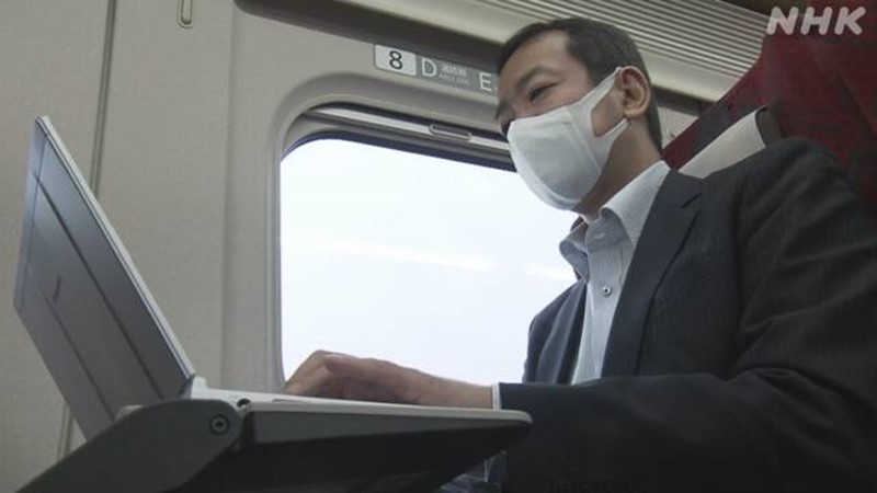一商務人士在專用車廂內辦公。(NHK電視臺視頻截圖)