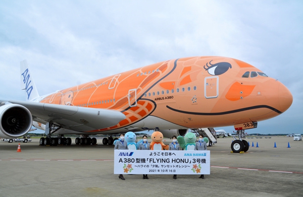 據悉,全日空的A380三號機是今年10月剛剛在法國建造完成,并于10月16日飛抵東京成田機場的?湛虯380為超大型雙層飛機,可搭載520名乘客。該機型在日本被昵稱為“FLYING HONU”,即飛天海龜。(編譯:陳建軍)