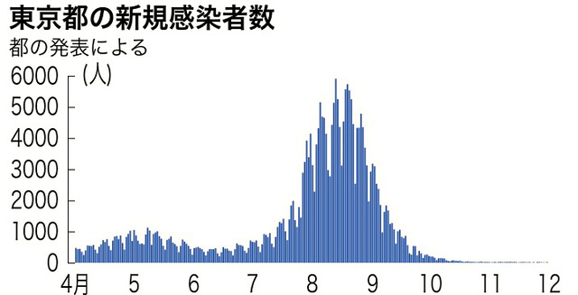 東京都最近半年間的新增確診病例數變化趨勢圖。(圖片來源:《朝日新聞》)