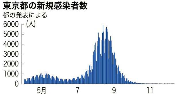 東京都最近半年間的新增確診病例數變化趨勢圖。(圖片來源:《朝日新聞》)