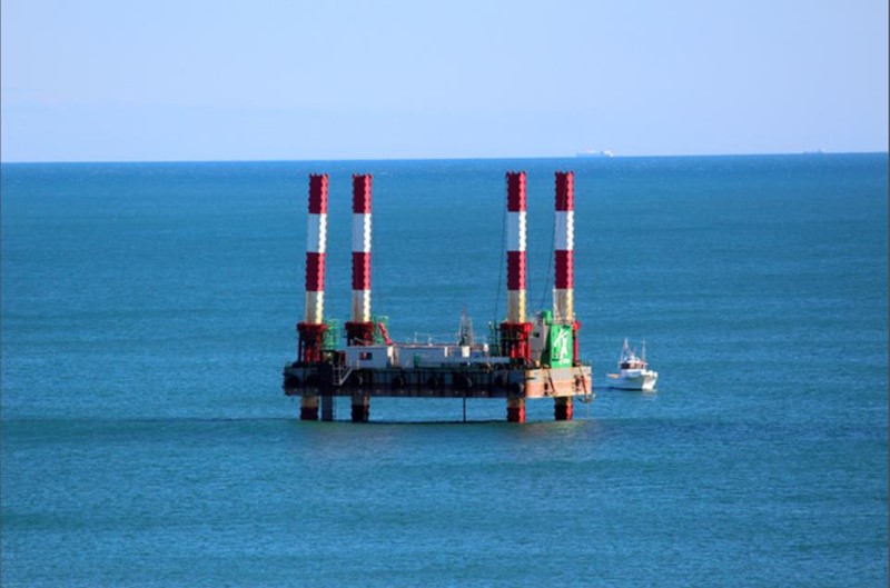 日本東京電力公司在福島第一核電站附近海域搭建鉆井平臺,為了修建海底隧道而提前開展鉆探調查。(圖片來源:《朝日新聞》網站)