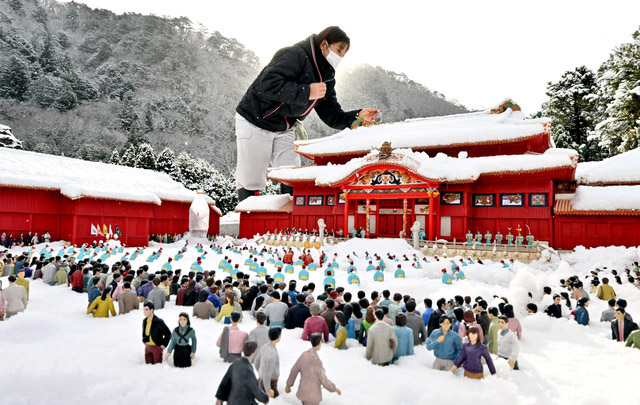東武世界廣場主題公園里的“首里城”被積雪覆蓋。(圖片來源:《朝日新聞》)