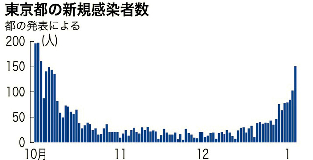 東京都近期的新增確診病例數變化趨勢圖。(圖片來源:《朝日新聞》)