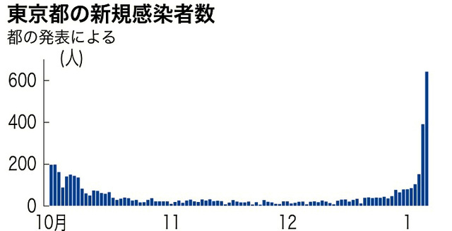 東京都近期的新增確診病例數變化趨勢圖。(圖片來源:《朝日新聞》)