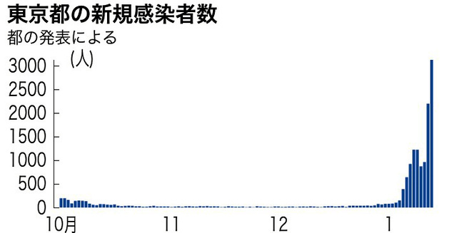 13日,東京都新增確診病例3124例,單日新增自去年9月2日(3097例)以來、時隔大約4個月再次超過3000例。截至1月13日,東京都最近一周的日均新增確診病例數為1503.4例,是前一周(218.0例)的大約7倍。從新增確診病例的年齡層來看,20多歲的最多,達到1093例。其次是30多歲的有616例,40多歲的有413例,10多歲的有310例,50多歲的有275例,不滿10歲的有187例,65歲以上的有158例。