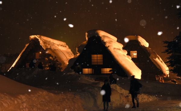 近年來,因為暖冬氣候當地下雪較少,然而今年的降雪量卻超過130厘米。伴隨著日落西山,32棟合掌屋在雪中相繼被燈光照亮。