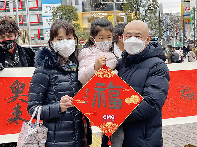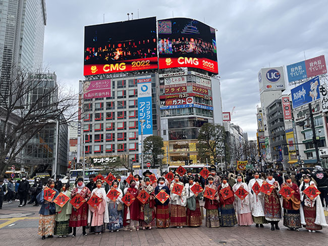 1月30日,日本東京澀谷十字路口戶外大屏幕上播放春晚宣傳片。身穿傳統中國服裝的文化使者們,向當地民眾贈送中國書法家書寫的“!弊。圖片由中央廣播電視總臺亞太總站提供。