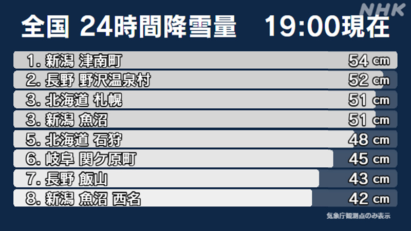 日本氣象廳統計的24小時降雪量顯示,截至2月6日,滋賀縣米原市的降雪量達到62厘米、札幌市的降雪量達到60厘米,分別創下有相關統計以來的最高記錄。
