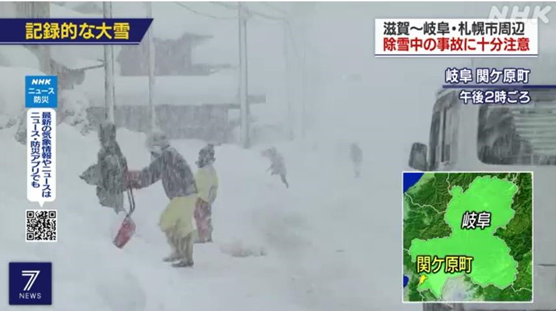 岐阜縣關原町遭遇有史以來最強降雪,當地積雪厚度達到88厘米。(NHK電視臺視頻截圖)