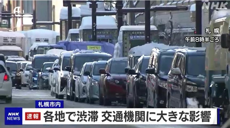 2月7日,由于強降雪導致道路變窄,札幌市內多條主干道出現堵塞。(NHK電視臺視頻截圖)