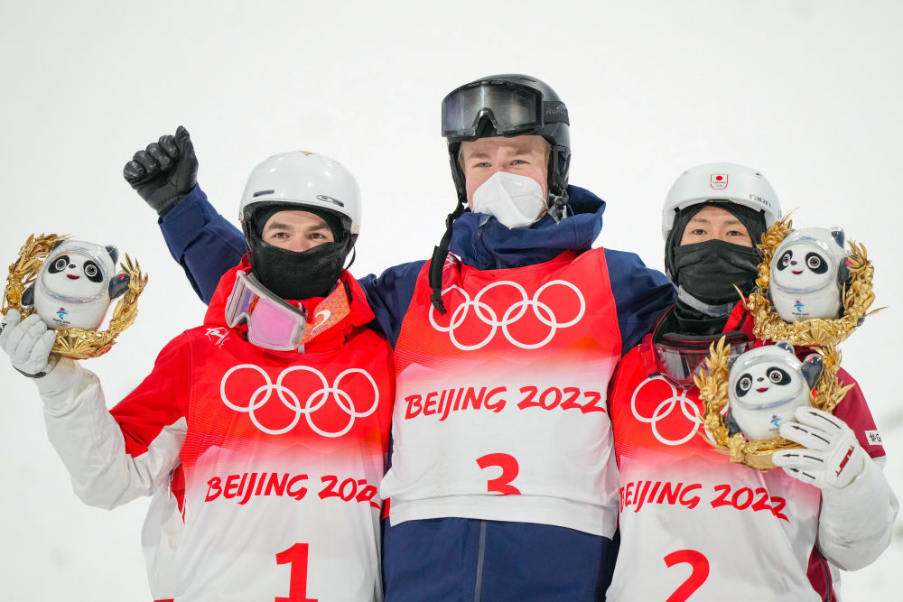 2月5日,冠軍瑞典選手瓦爾特·瓦爾貝里(中)、亞軍加拿大選手邁克爾·金斯伯里(左)和季軍日本選手堀島行真在頒獎儀式上。新華社記者 薛玉斌 攝