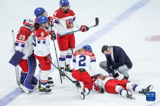 2月8日,捷克隊球員克拉拉·希姆拉羅娃在比賽中受傷倒地。 新華社記者 張玉薇 攝