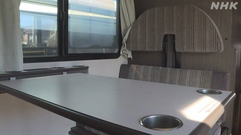 房車內配有床鋪、桌子、廁所等日常生活所需設備。(NHK電視臺視頻截圖)