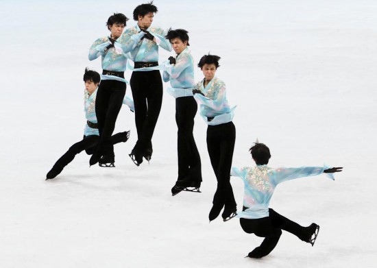 2月10日,日本選手羽生結弦在北京冬奧會花樣滑冰男子單人滑自由滑比賽中嘗試阿克塞爾四周跳(拼接照片)。新華社記者曹燦攝
