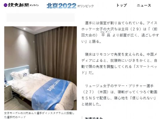 日本《讀賣新聞》7日也刊文介紹了奧運村的食宿和防疫。文章援引日本女子冰球選手大澤千穗的話說,房間比往屆奧運會的“寬敞很多,很舒適”。