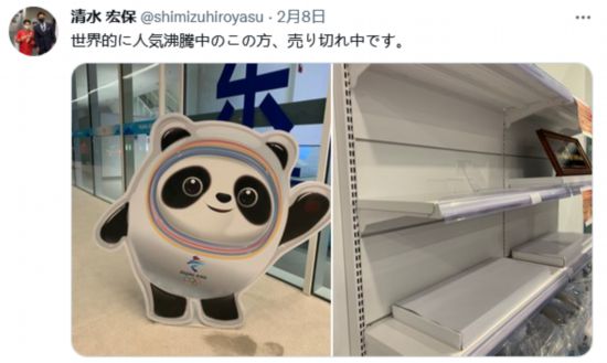 日本長野冬奧會短道速滑500米金牌獲得者清水宏保8日也在自己的推特上介紹了“冰墩墩”的人氣!啊斩铡呀浕鸬搅巳澜,紀念品全部脫銷中!