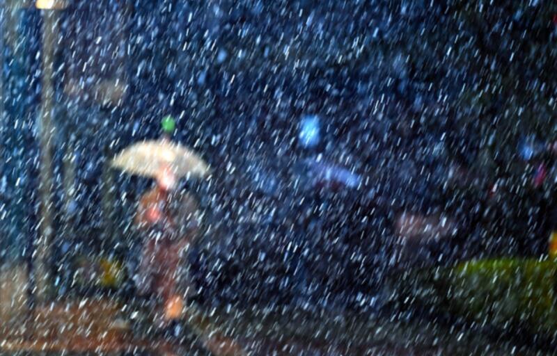 10日傍晚,東京都千代田區冒雪趕路的行人。(圖片來源:《朝日新聞》)