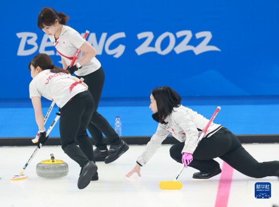 當日,在北京國家游泳中心“冰立方”舉行的北京2022年冬奧會女子冰壺循環賽中,英國隊以10比4戰勝日本隊。新華社記者 劉續 攝