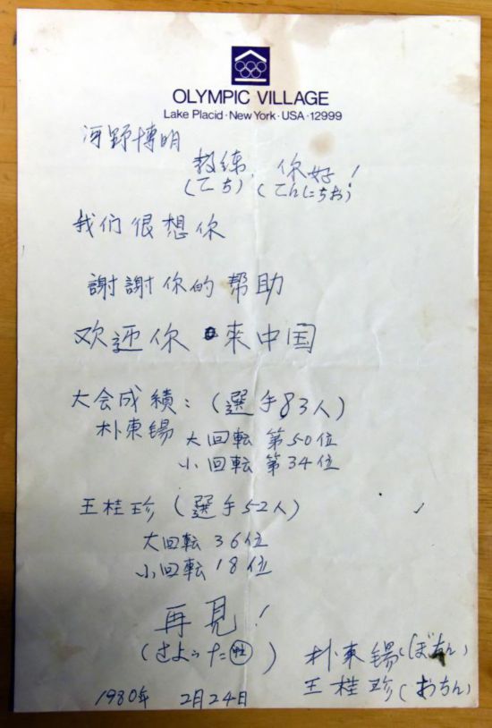 河野博明教練,你好!我們很想你,謝謝你的幫助,歡迎你來中國。大會成績(選手83人):樸東錫大回轉第50位,小回轉第34位。王桂珍(選手52人)大回轉36位(注:最終官方成績是51名選手第35位),小回轉18位。再見。