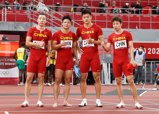 2021年8月6日,中國隊隊員吳智強、蘇炳添、謝震業和湯星強(從左至右)在東京奧運會男子4x100米接力比賽后。新華社記者王麗莉攝