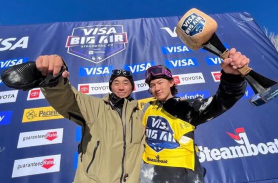 2021年12月5日,蘇翊鳴獲得單板滑雪大跳臺世界杯冠軍后與教練在一起。受訪者供圖