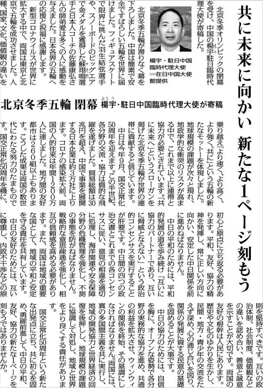 2022年2月23日,中國駐日本使館臨時代辦楊宇在日本五大全國性報紙之一的《每日新聞》發表題為《一起向未來,共寫新篇章》的署名文章,宣介北京冬奧會成功舉辦的積極意義,闡明對當前中日關系的看法主張,結合中日邦交正;50周年重要節點,強調雙方應落實兩國領導人共識,回歸初心和原點,發揚和平、友好、合作精神,推動中日關系沿著正確方向行穩致遠。全文如下: