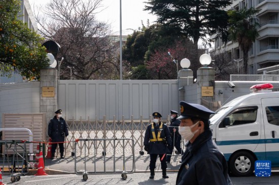 2月23日,在日本東京,警察站在俄羅斯駐日本大使館外。新華社記者 張笑宇 攝