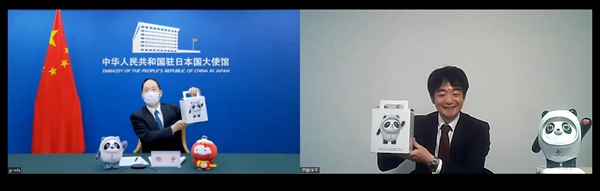 2月23日,中國駐日本大使館臨時代辦楊宇(左)以“云方式”向日中友協理事長代理永田哲二(右)贈禮。(圖片為云端對話活動截圖)