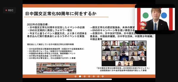 2月23日,日中友協青年委員會委員長伊藤洋平發表紀念邦交正;50周年活動設想。(圖片為云端對話活動截圖)