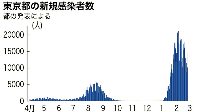 東京都近期的新增確診病例數變化趨勢圖。(圖片來源:《朝日新聞》)