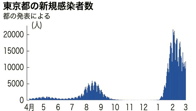 3月2日,東京都新增確診病例1萬2693例,單日新增連續3天超過1萬例。截至2日,東京都最近一周的日均新增確診病例數為1萬1045.0例,是前一周的81.2%。