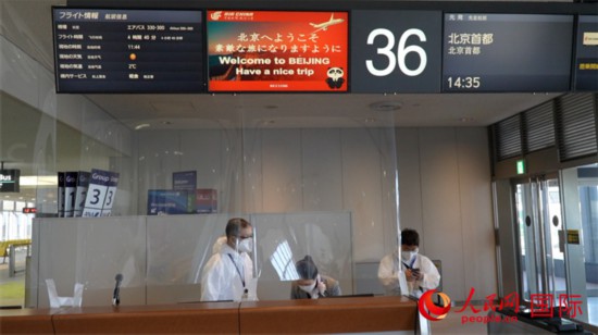 2月21日,登機口信息指示屏上打出由國航日本地區總部工作人員精心設計制作的標語“北京歡迎您,祝您旅程愉快”。青城攝