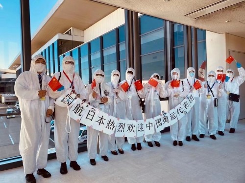 東京奧運會期間,國航日本地區總部工作人員熱烈歡迎中國奧運代表團。國航日本地區總部供圖