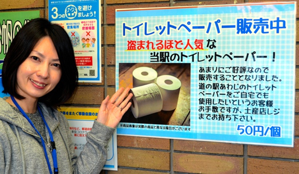 去年6月,“道之驛·淡路”的運營公司企劃宣傳科女員工關可菜在網上看到一則消息,說是熊本縣的一座“道之驛”在廁所內張貼了“火到被人偷的廁紙在商店中有售”字樣的宣傳海報。她想到,“這種方式可能比嚴肅警告更有效果”。于是,她馬上嘗試著在女廁所的入口處也貼上了類似的宣傳海報,并在該設施內的特產店內直接賣起了相同的廁紙。