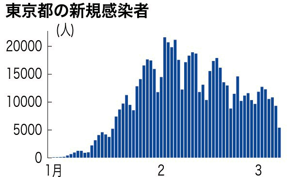 3月7日,東京都新增確診病例5374例,單日新增自1月18日以來、時隔大約一個半月首次降至6千例以下。截至7日,東京都最近一周的日均新增確診病例數為1萬391例,是前一周的92.3%。