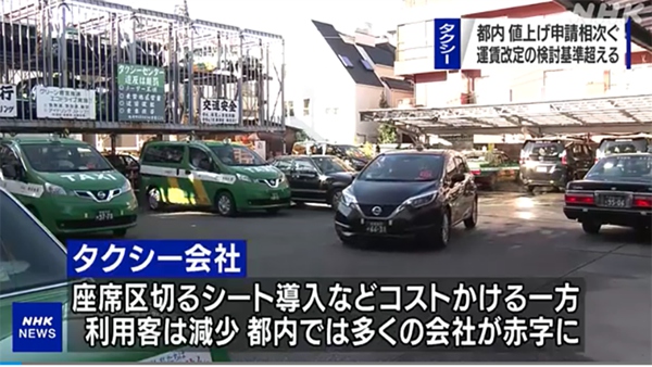 東京都的出租車公司紛紛申請提高收費標準。(NHK電視臺視頻截圖)
