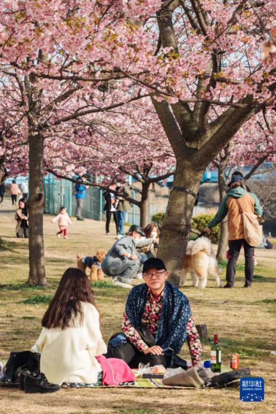 3月9日,人們在日本東京舊中川沿岸欣賞綻放的櫻花。新華社記者 張笑宇 攝