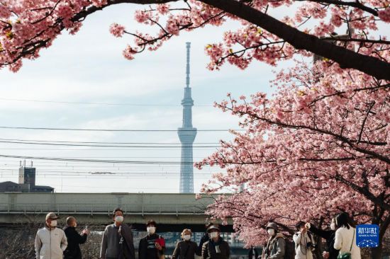 3月9日,人們在日本東京舊中川沿岸欣賞綻放的櫻花。新華社記者 張笑宇 攝