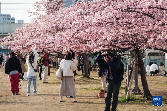 3月9日,人們在日本東京舊中川沿岸欣賞綻放的櫻花。新華社記者 張笑宇 攝