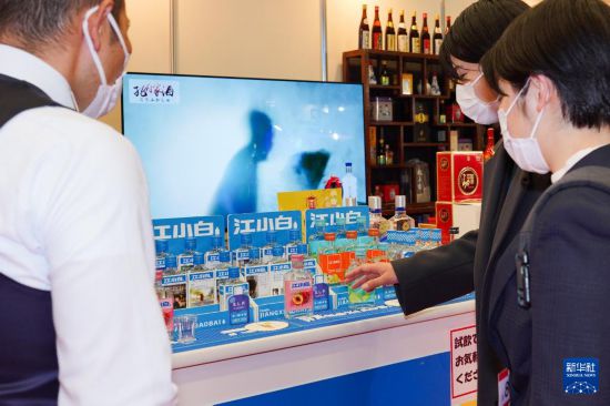 3月8日,參觀者在日本千葉舉辦的食品和飲料博覽會上了解來自中國的白酒產品。 日本千葉8日至11日舉辦國際食品和飲料博覽會,來自44個國家和地區的近1500家公司參展。 新華社記者 張笑宇 攝