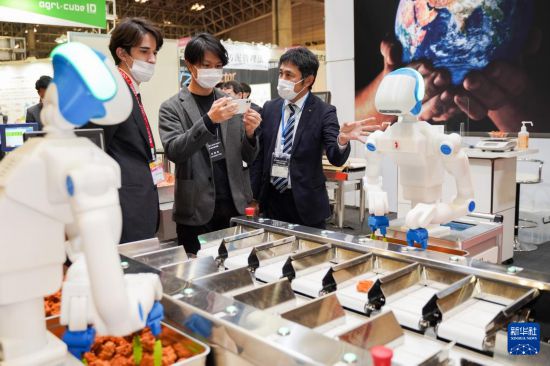 3月8日,參觀者在日本千葉舉辦的食品和飲料博覽會上參觀自動分揀炸雞機器人。 新華社記者 張笑宇 攝