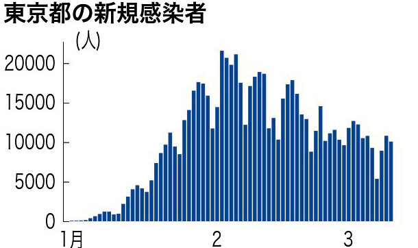 3月10日,東京都新增確診病例1萬80例,與上周四相比減少了2171例。截至10日,東京都最近一周的日均新增確診病例數為9402.0例,是前一周的82.9%。