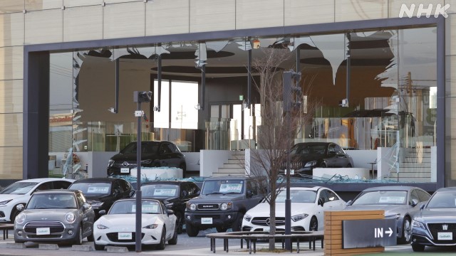 3月16日,日本強震導致建筑物玻璃碎落。 圖片來源:NHK報道截圖。