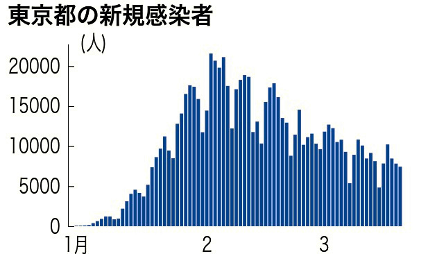 3月20日,東京都新增確診病例6502例,單日新增連續4天低于1萬例。截至20日,東京都最近一周的日均新增確診病例數為7589.3例,是前一周的87.1%。