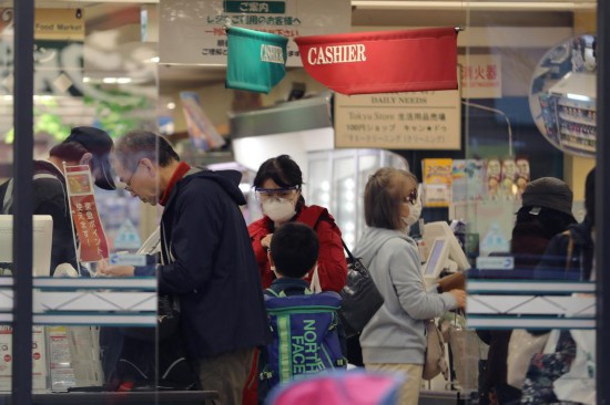 2020年4月8日,在日本東京,顧客在一家超市內購物結賬。(新華社記者杜瀟逸攝)