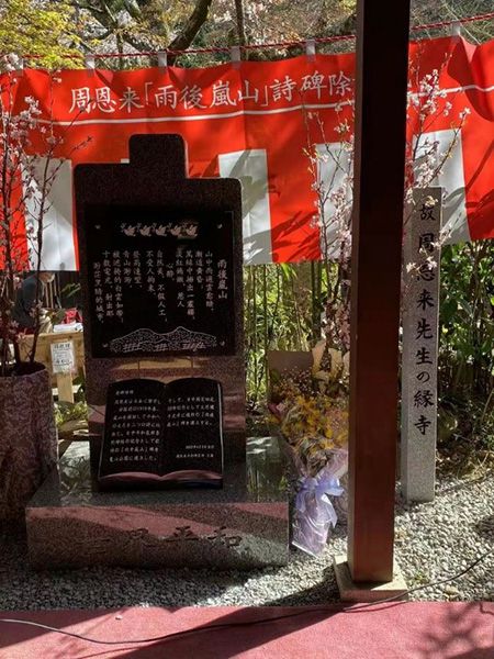 人民網東京4月8日電 (孫璐、吳穎)日前,周恩來總理留學日本時創作的《雨后嵐山》詩碑落成揭幕儀式在京都嵐山地區的大悲閣千光寺舉辦,約30位中日民間人士參加現場活動。繼1979年《雨中嵐山》詩碑于龜山公園落成后,京都嵐山再添第二座周恩來詩碑,兩碑隔河相望。揭幕儀式后的紀念活動中,中國駐大阪總領事薛劍、京都市長門川大作等各界人士對詩碑的落成表達了祝賀。