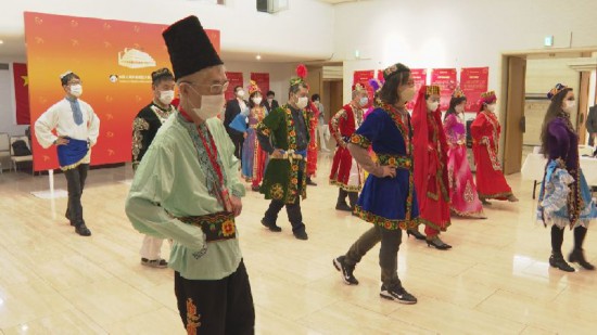 中國駐大阪總領館線上歌舞教學活動現場,日本民眾齊跳新疆傳統民族舞。