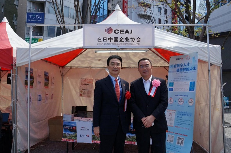 4月9日,在日中國企業協會會長王家馴(左)和中國國際貿易促進委員會駐日本代表處總代表鞠文永(右)在協會展臺前參與當天的活動。(吳穎 攝)