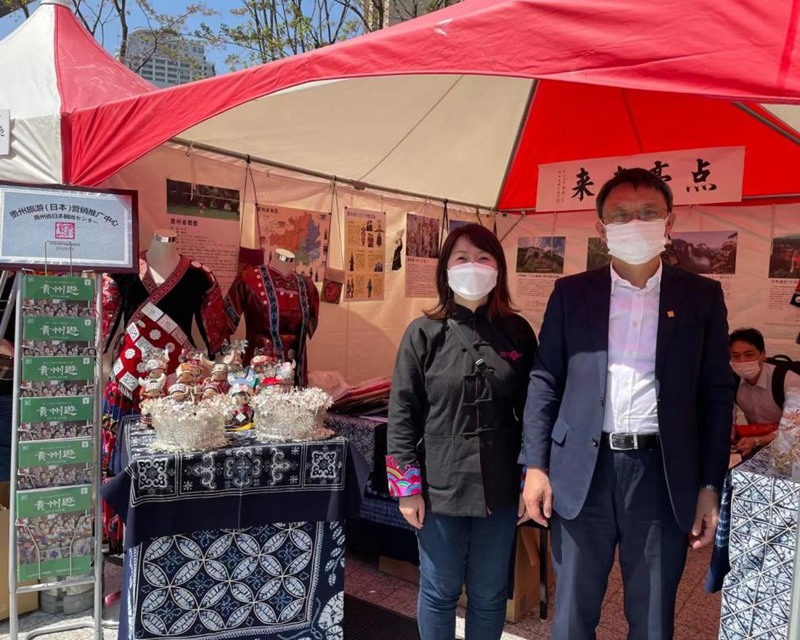 4月9日,東京中國文化中心主任羅玉泉(右)和文化中心工作人員在現場的中國文化展臺。(吳穎 攝)