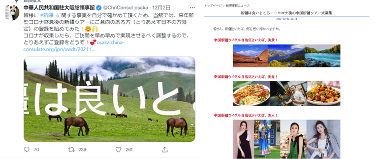 中國駐大阪總領館在官網和社交媒體上發布題為“新疆是個好地方——疫情后赴中國新疆旅游招募”信息。網絡截圖